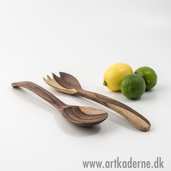 Et smukt og dejligt stort salatbestik i 2-farvet træ, bestående af salat ske og salatgaffel, begge i skeform. Det fine salatværktøj i træ er kunstnerisk håndformet i palisandertræ (Rosewood), der med sine lyse og mørkekontraster med de naturlige træårer giver et smukt farvespil - ikke 2 sæt er ens, hverken i farve eller form.